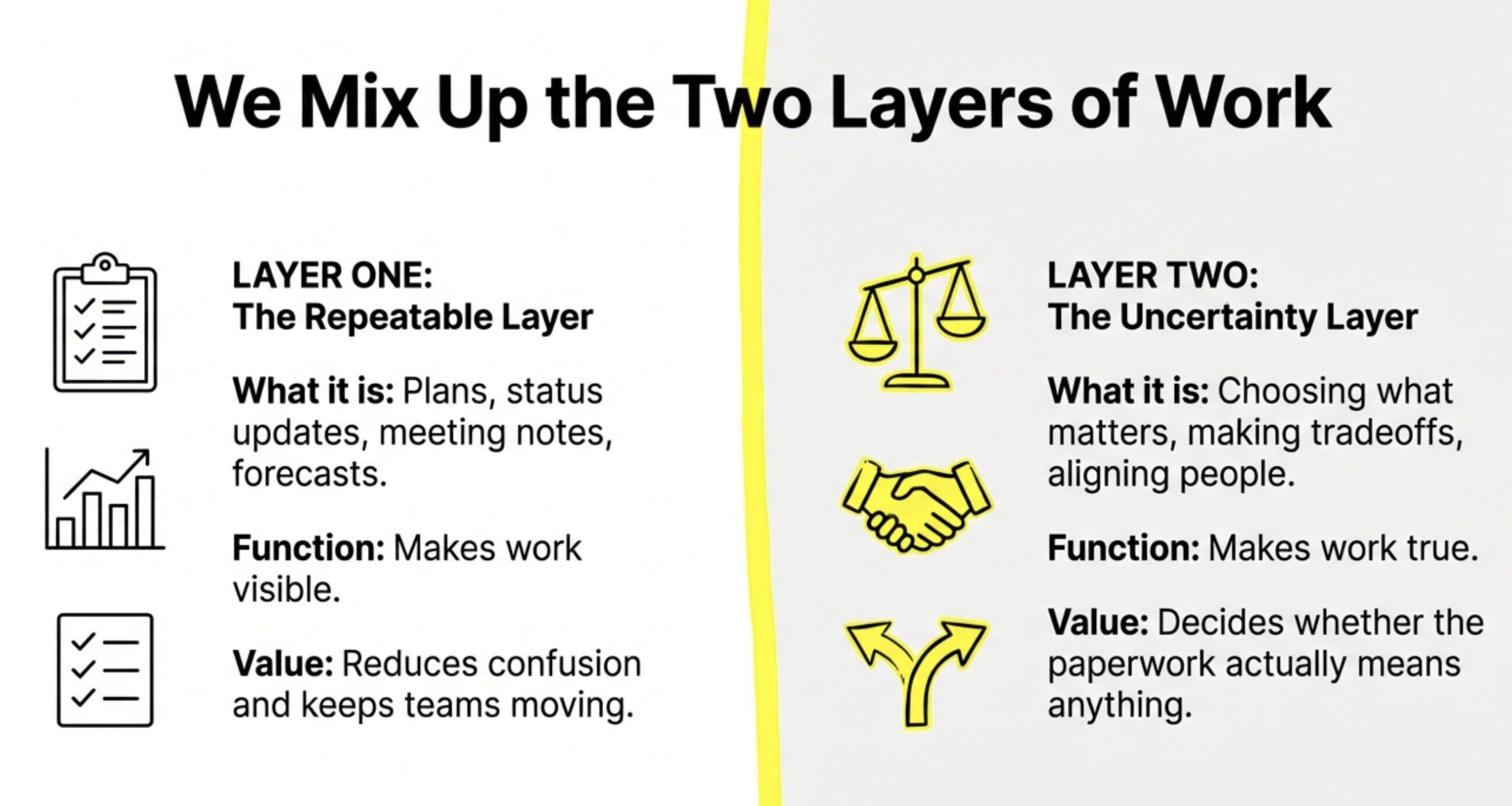 That’s because most work has two layers, and we mix them up all the time. Layer one is the repeatable layer, the paperwork and coordination that helps people see the work and follow it: plans, status updates, meeting notes, task lists, forecasts, dashboards, risk lists. This layer is real work. It reduces confusion and keeps teams moving. Layer two is the uncertainty layer, the part that decides whether the paperwork means anything: choosing what matters when goals conflict, making tradeoffs when you can’t have everything, aligning people who don’t fully agree, and getting commitment when the answer isn’t obvious. Layer one makes work visible. Layer two makes work true.